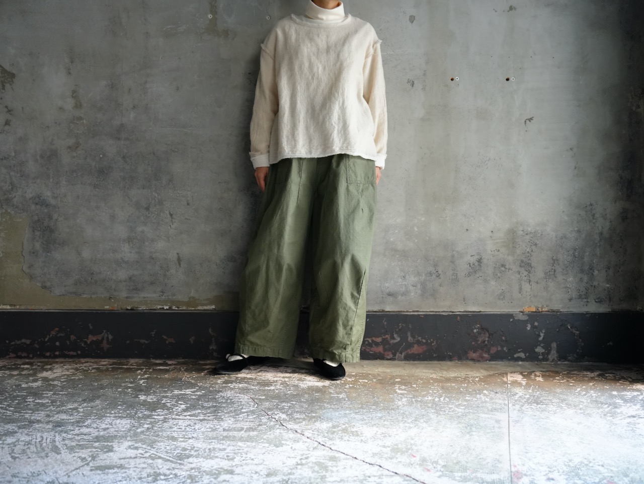 総裏のリバーシブル仕様。B面には贅沢にもオーガニックコットンを使用しています。表裏で大きく縮率の異なる生地ですが、縫製もデザイナー自らが手掛けるwright.らしく、サイズ感や裁ち切りやディテールに至るまで、どこか粗野素朴なその外見とは裏腹に、どちらが表裏か分からないくらい丁寧な作りです。