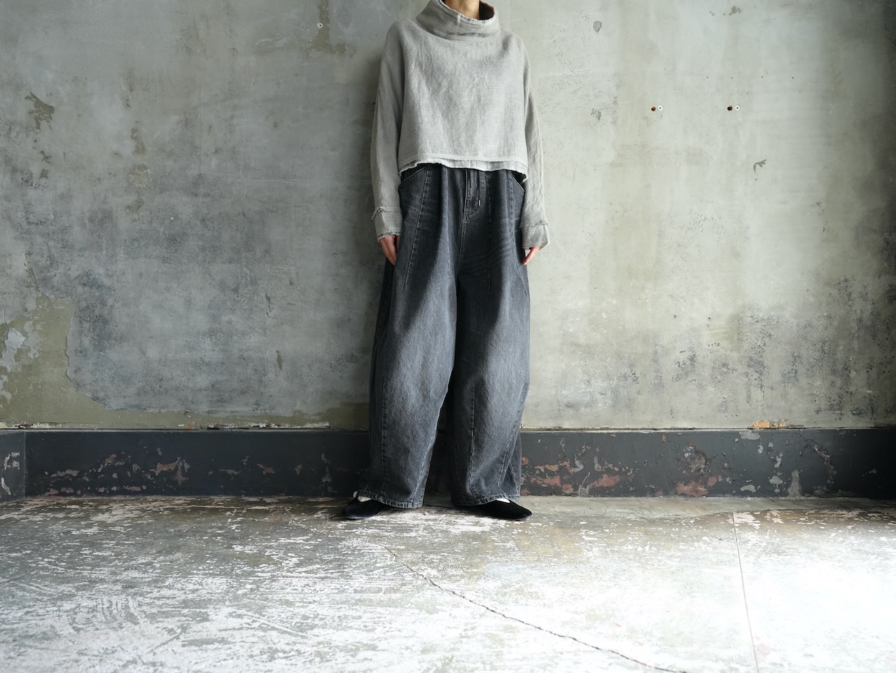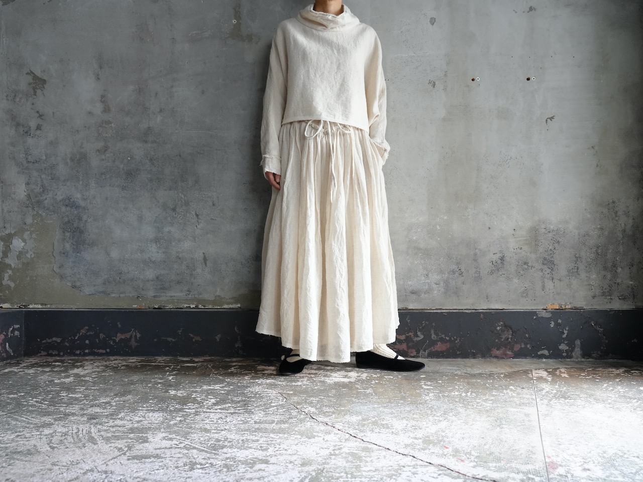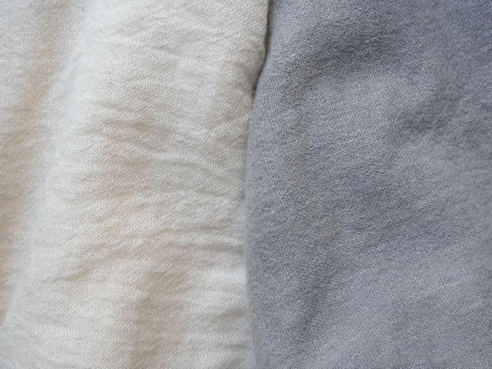 ash greyはデザイナー自らの手染めによる生地染め、ガーゼの生地感も相まって印象的なグレーです。