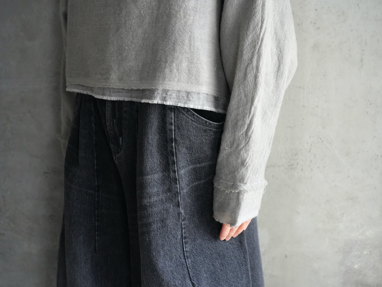 ガーゼの生地感も相まって印象的なグレーです。