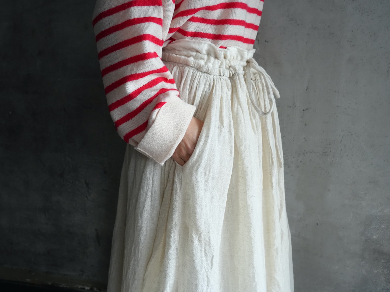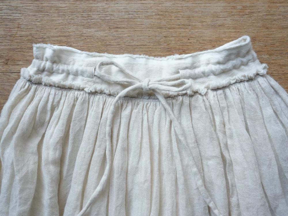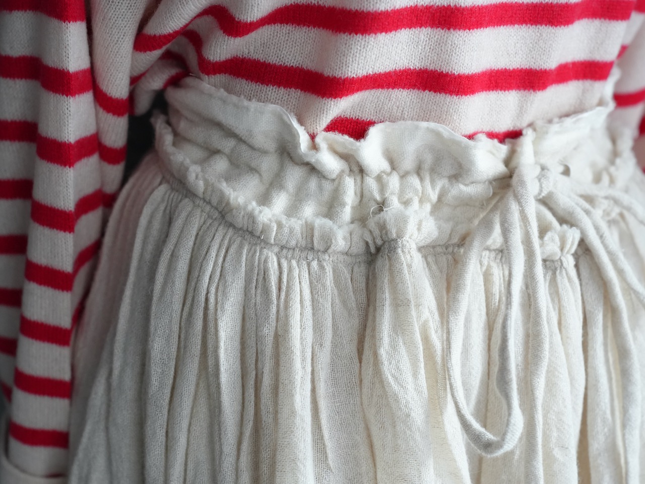 ウールリネンガーゼ側のヘムラインには生地耳が使用されています。白のトリミングがアクセントになって可愛い。